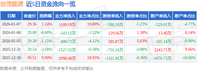 证券之星消息,截至2026年1月7日收盘,世茂能源(605028)报收于29.36元,上涨1.24%,换手率2.38%,成交量3.81万手,成交额1.11亿元。