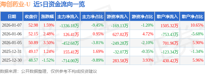 证券之星消息,截至2026年1月7日收盘,海创药业(688302)报收于52.98元,上涨1.59%,换手率2.69%,成交量2.67万手,成交额1.41亿元。