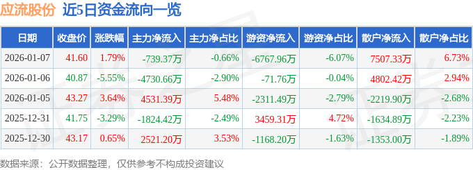 证券之星消息,截至2026年1月7日收盘,应流股份(603308)报收于41.6元,上涨1.79%,换手率3.93%,成交量26.72万手,成交额11.15亿元。