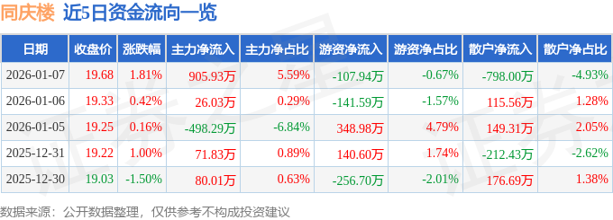 证券之星消息,截至2026年1月7日收盘,同庆楼(605108)报收于19.68元,上涨1.81%,换手率3.18%,成交量8.26万手,成交额1.62亿元。