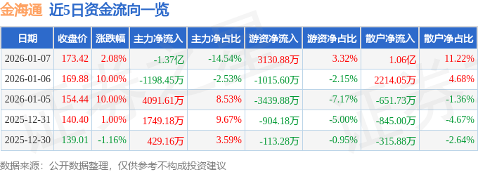 证券之星消息,截至2026年1月7日收盘,金海通(603061)报收于173.42元,上涨2.08%,换手率13.26%,成交量5.54万手,成交额9.42亿元。