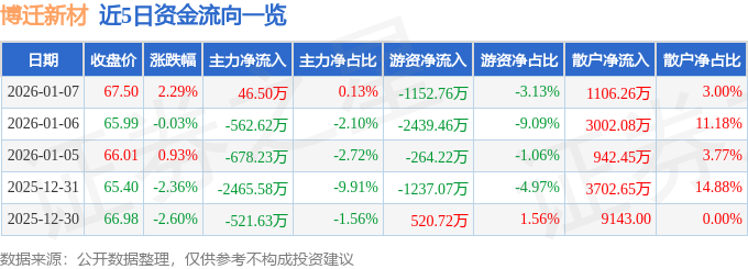 证券之星消息,截至2026年1月7日收盘,博迁新材(605376)报收于67.5元,上涨2.29%,换手率2.1%,成交量5.49万手,成交额3.68亿元。