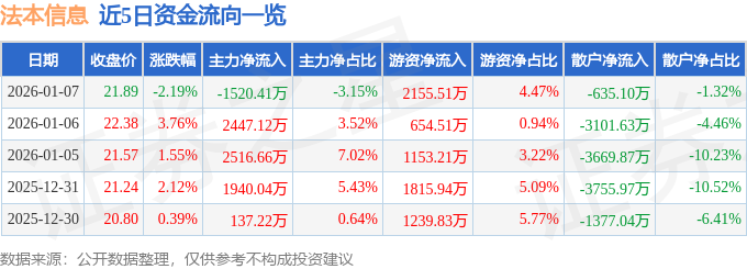 证券之星消息,截至2026年1月7日收盘,法本信息(300925)报收于21.89元,下跌2.19%,换手率6.27%,成交量21.92万手,成交额4.82亿元。