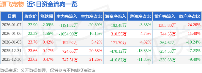 证券之星消息,截至2026年1月7日收盘,源飞宠物(001222)报收于22.9元,下跌2.09%,换手率2.3%,成交量2.47万手,成交额5703.01万元。