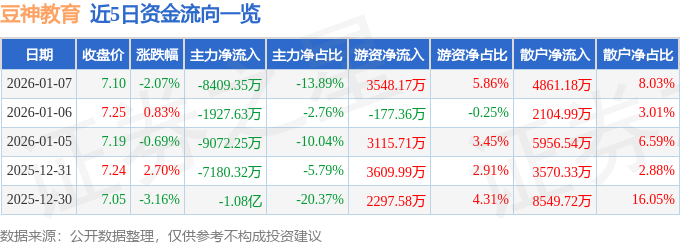 证券之星消息,截至2026年1月7日收盘,豆神教育(300010)报收于7.1元,下跌2.07%,换手率5.11%,成交量84.95万手,成交额6.05亿元。