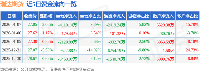 证券之星消息,截至2026年1月7日收盘,瑞达期货(002961)报收于27.05元,下跌2.06%,换手率3.3%,成交量15.18万手,成交额4.16亿元。