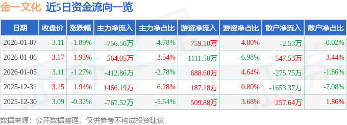 证券之星消息,截至2026年1月7日收盘,金一文化(002721)报收于3.11元,下跌1.89%,换手率1.91%,成交量50.67万手,成交额1.58亿元。