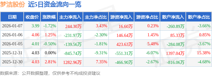 1月7日的资金流向数据方面,主力资金净流入244.3万元,占总成交额3.43%,游资资金净流入16.6万元,占总成交额0.23%,散户资金净流出260.89万元,占总成交额3.66%。