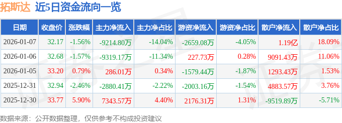 证券之星消息,截至2026年1月7日收盘,拓斯达(300607)报收于32.17元,下跌1.56%,换手率6.11%,成交量20.27万手,成交额6.56亿元。