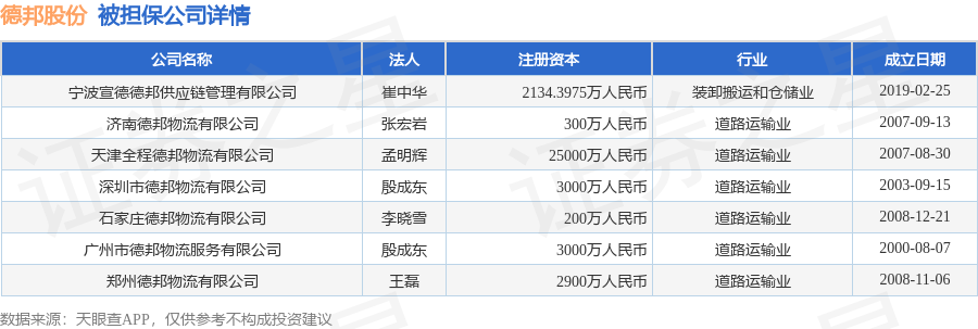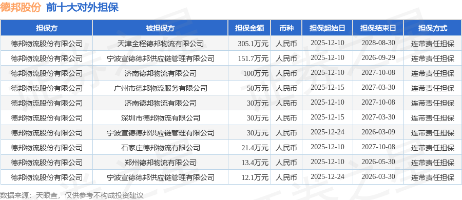 德邦股份1月6日披露13笔对外担保,被担保公司9家。担保金额排在前十的对外担保明细如下表: