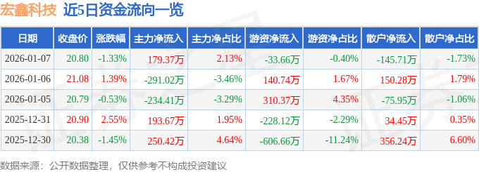证券之星消息,截至2026年1月7日收盘,宏鑫科技(301539)报收于20.8元,下跌1.33%,换手率5.39%,成交量4.05万手,成交额8403.84万元。