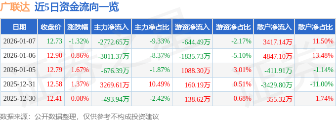 1月7日的资金流向数据方面,主力资金净流出2772.65万元,占总成交额9.33%,游资资金净流出644.49万元,占总成交额2.17%,散户资金净流入3417.14万元,占总成交额11.5%。
