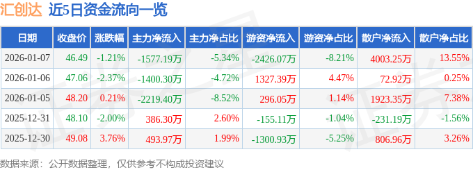 证券之星消息,截至2026年1月7日收盘,汇创达(300909)报收于46.49元,下跌1.21%,换手率5.14%,成交量6.29万手,成交额2.95亿元。