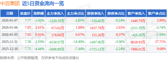 证券之星消息,截至2026年1月7日收盘,中百集团(000759)报收于7.77元,下跌1.02%,换手率9.79%,成交量64.17万手,成交额5.01亿元。