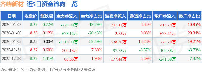 证券之星消息,截至2026年1月7日收盘,齐峰新材(002521)报收于8.27元,下跌0.72%,换手率1.09%,成交量4.56万手,成交额3777.99万元。