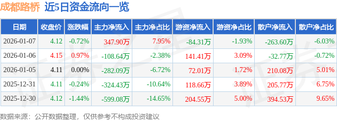 证券之星消息,截至2026年1月7日收盘,成都路桥(002628)报收于4.12元,下跌0.72%,换手率1.4%,成交量10.56万手,成交额4373.4万元。