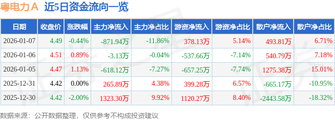 证券之星消息,截至2026年1月7日收盘,粤电力A(000539)报收于4.49元,下跌0.44%,换手率0.64%,成交量16.31万手,成交额7354.8万元。