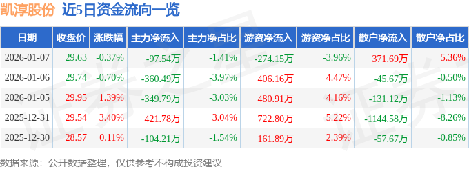 证券之星消息,截至2026年1月7日收盘,凯淳股份(301001)报收于29.63元,下跌0.37%,换手率4.65%,成交量2.34万手,成交额6928.28万元。