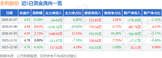 证券之星消息,截至2026年1月7日收盘,永利股份(300230)报收于4.93元,下跌0.2%,换手率2.44%,成交量15.36万手,成交额7583.97万元。