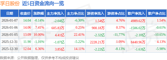 1月7日的资金流向数据方面,主力资金净流出2.04亿元,占总成交额6.3%,游资资金净流入1.54亿元,占总成交额4.76%,散户资金净流入4989.62万元,占总成交额1.54%。