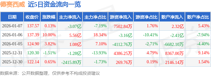 1月7日的资金流向数据方面,主力资金净流出3.07亿元,占总成交额7.19%,游资资金净流入7502.84万元,占总成交额1.76%,散户资金净流入2.32亿元,占总成交额5.43%。