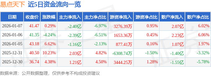 证券之星消息,截至2026年1月7日收盘,易点天下(301171)报收于41.47元,上涨0.29%,换手率21.53%,成交量82.0万手,成交额34.39亿元。