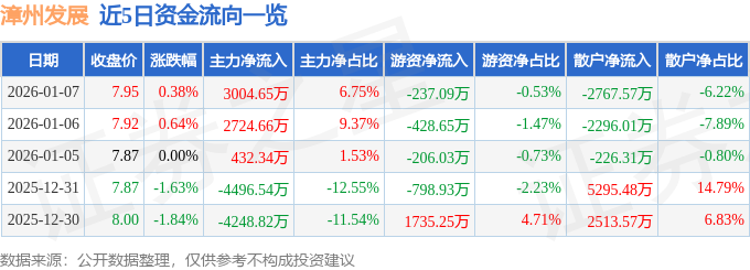 证券之星消息,截至2026年1月7日收盘,漳州发展(000753)报收于7.95元,上涨0.38%,换手率5.64%,成交量55.91万手,成交额4.45亿元。