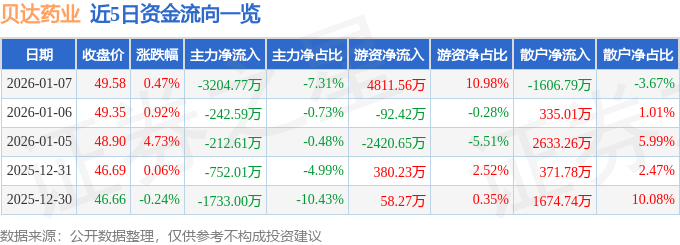证券之星消息,截至2026年1月7日收盘,贝达药业(300558)报收于49.58元,上涨0.47%,换手率2.11%,成交量8.83万手,成交额4.38亿元。