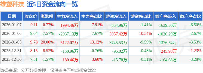 证券之星消息,截至2026年1月7日收盘,雄塑科技(300599)报收于9.11元,上涨0.77%,换手率12.86%,成交量27.31万手,成交额2.52亿元。
