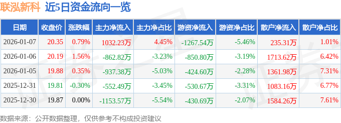 证券之星消息,截至2026年1月7日收盘,联泓新科(003022)报收于20.35元,上涨0.79%,换手率0.86%,成交量11.42万手,成交额2.32亿元。