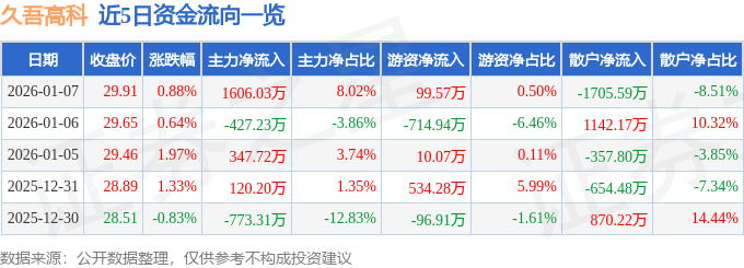 证券之星消息,截至2026年1月7日收盘,久吾高科(300631)报收于29.91元,上涨0.88%,换手率5.52%,成交量6.66万手,成交额2.0亿元。