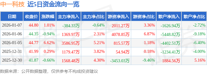 证券之星消息,截至2026年1月7日收盘,中一科技(301150)报收于44.8元,上涨1.01%,换手率6.03%,成交量13.42万手,成交额5.99亿元。