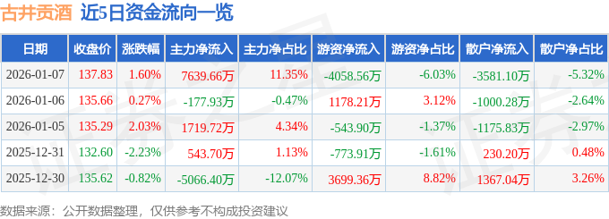 证券之星消息,截至2026年1月7日收盘,古井贡酒(000596)报收于137.83元,上涨1.6%,换手率1.21%,成交量4.95万手,成交额6.73亿元。