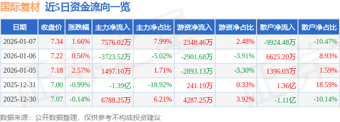 证券之星消息,截至2026年1月7日收盘,国际复材(301526)报收于7.34元,上涨1.66%,换手率9.23%,成交量129.65万手,成交额9.48亿元。