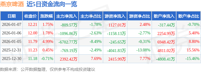 证券之星消息,截至2026年1月7日收盘,燕京啤酒(000729)报收于12.21元,上涨1.75%,换手率1.49%,成交量37.42万手,成交额4.55亿元。