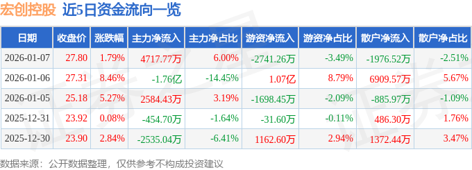 证券之星消息,截至2026年1月7日收盘,宏创控股(002379)报收于27.8元,上涨1.79%,换手率2.49%,成交量28.25万手,成交额7.86亿元。