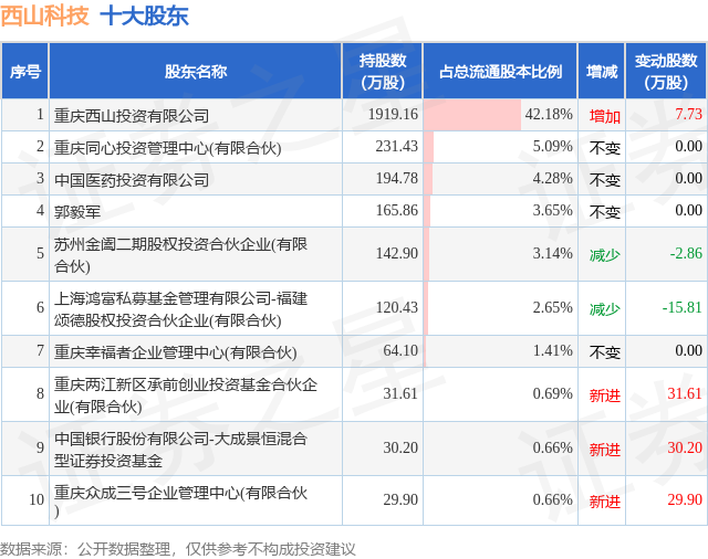 证券之星消息,1月7日西山科技发布公告《西山科技:重庆西山科技股份有限公司关于控股股东增持公司股份计划实施完毕暨结果公告》,其股东重庆西山投资有限公司于2025年7月10日至2025年9月29日间合计增持7.73万股,占公司目前总股本的0.17%,变动期间该股股价上涨1.87%,截止9月29日收盘报64.97元。