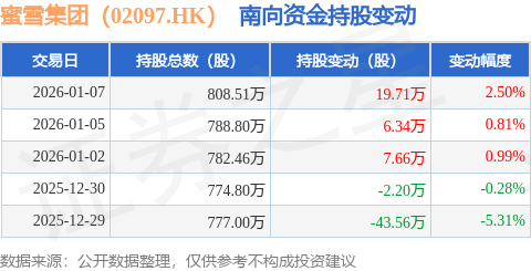证券之星消息,1月7日南向资金增持19.71万股蜜雪集团(02097.HK)。近5个交易日中,获南向资金减持的有2天,累计净减持12.05万股。近20个交易日中,获南向资金减持的有11天,累计净减持23.17万股。截至目前,南向资金持有蜜雪集团(02097.HK)808.51万股,占公司已发行普通股的5.34%。
