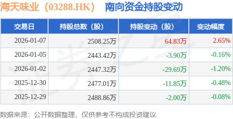 证券之星消息,1月7日南向资金增持64.83万股海天味业(03288.HK)。近5个交易日中,获南向资金增持的有1天,累计净增持17.39万股。近20个交易日中,获南向资金增持的有11天,累计净增持157.09万股。截至目前,南向资金持有海天味业(03288.HK)2508.25万股,占公司已发行普通股的8.6%。