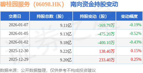 证券之星消息,1月7日南向资金减持169.79万股碧桂园服务(06098.HK)。近5个交易日中,获南向资金减持的有3天,累计净减持673.29万股。近20个交易日中,获南向资金减持的有12天,累计净减持2016.64万股。截至目前,南向资金持有碧桂园服务(06098.HK)9.11亿股,占公司已发行普通股的27.24%。