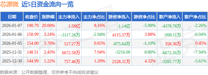 证券之星消息,截至2026年1月7日收盘,芯源微(688037)报收于190.79元,上涨20.0%,涨停,换手率5.31%,成交量10.7万手,成交额19.36亿元。