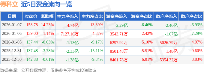 证券之星消息,截至2026年1月7日收盘,德科立(688205)报收于158.78元,上涨14.23%,换手率15.27%,成交量24.17万手,成交额35.44亿元。