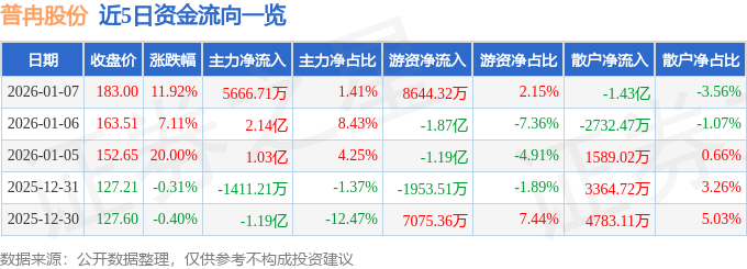 证券之星消息,截至2026年1月7日收盘,普冉股份(688766)报收于183.0元,上涨11.92%,换手率14.43%,成交量21.36万手,成交额40.16亿元。