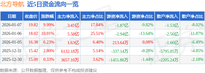证券之星消息,截至2026年1月7日收盘,北方导航(600435)报收于19.82元,上涨9.99%,已连续涨停2天,换手率6.51%,成交量98.43万手,成交额19.08亿元。