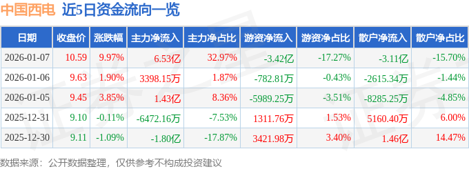 证券之星消息,截至2026年1月7日收盘,中国西电(601179)报收于10.59元,上涨9.97%,涨停,换手率3.72%,成交量190.49万手,成交额19.79亿元。