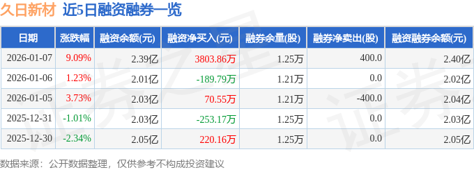 久日新材融资融券信息显示,融资方面,当日融资买入7911.01万元,融资偿还4107.16万元,融资净买入3803.86万元。融券方面,融券卖出400.0股,融券偿还0.0股,融券余量1.25万股,融券余额33.75万元。融资融券余额2.4亿元。