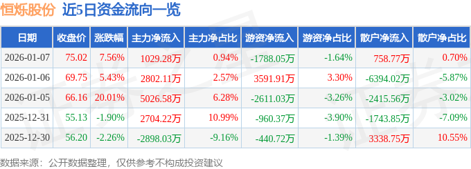 证券之星消息,截至2026年1月7日收盘,恒烁股份(688416)报收于75.02元,上涨7.56%,换手率22.13%,成交量14.46万手,成交额10.91亿元。