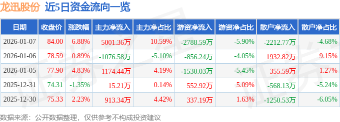 1月7日的资金流向数据方面,主力资金净流入5001.36万元,占总成交额10.59%,游资资金净流出2788.59万元,占总成交额5.9%,散户资金净流出2212.77万元,占总成交额4.68%。