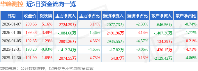 证券之星消息,截至2026年1月7日收盘,华峰测控(688200)报收于209.66元,上涨5.16%,换手率3.1%,成交量4.19万手,成交额8.68亿元。