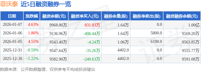 菲沃泰融资融券信息显示,融资方面,当日融资买入1743.84万元,融资偿还912.01万元,融资净买入831.83万元。融券方面,融券卖出0.0股,融券偿还0.0股,融券余量1.64万股,融券余额33.73万元。融资融券余额1.0亿元。